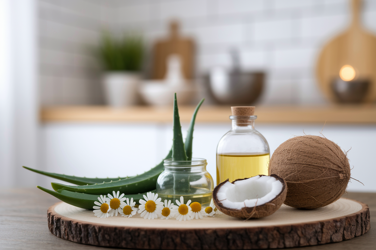 L’huile de coco vierge possède des propriétés antifongiques naturelles. Réchauffez-la entre vos mains et massez délicatement votre cuir chevelu. Laissez agir toute la nuit si possible, puis shampouinez le matin.